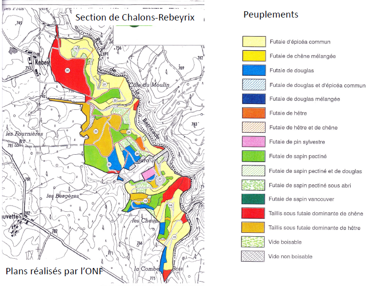 67% de la surface sont en reboisements artificiels et 33% sont d’anciens taillis sous futaies en cours de conversion ou transformation. Les forêts résineuses (douglas 25%, Epicéa 23%, Sapins 18%) sont plutôt jeunes. Il faut savoir que les plantations ont été réalisées sous forme de trois contrats en travaux du Font Forestier National sur la période 1975-1981. A cette époque, l’état a avancé le montant des travaux de plantation et de création de pistes à un taux d’intérêts faible (1,5%). Ceci concerne les sections de »Besse et Sauvettes », « Chalons et Chalons Rebeyrix »et du « Mareix ». Jusqu’à ce jour, l’état se rembourse sur les coupes de bois réalisées mais la dette reste encore importante.