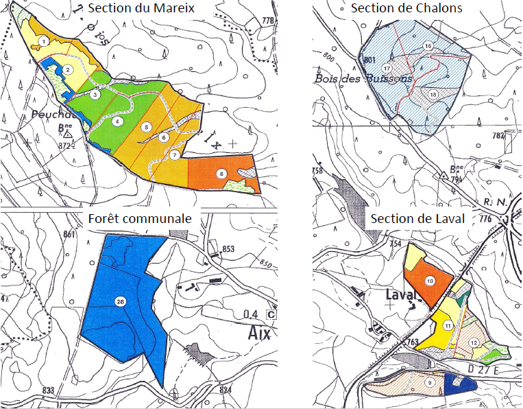 A une altitude oscillant entre 636 m et 860 m, les parcelles forestières se répartissent de la façon suivante (voir carte) :