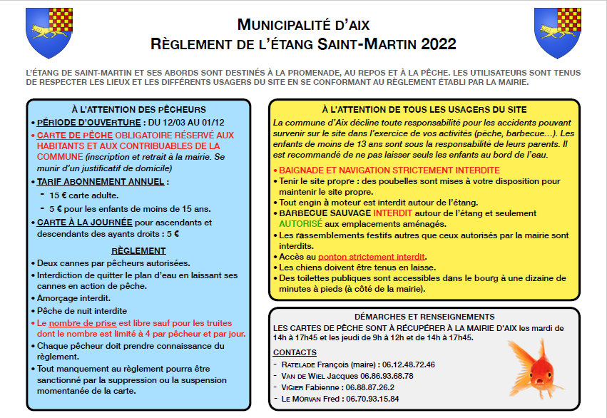 Vous êtes résidents et/ou contribuables aixois et souhaitez pêcher à l’étang de Saint-Martin (sur la route de Montasserre), pensez à venir récupérer une carte de pêche à la mairie. Vous trouverez ci-dessous tous les renseignements utiles (règlement, tarif, contact…) .